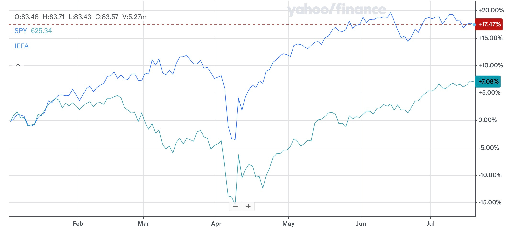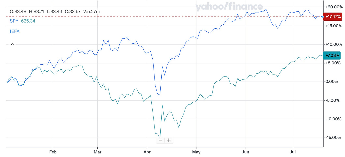 The points above may be valid, but the following graph may surprise you. Year-to-date IEFA has returned more than double the S&P500! Not too shabby for old Europe.